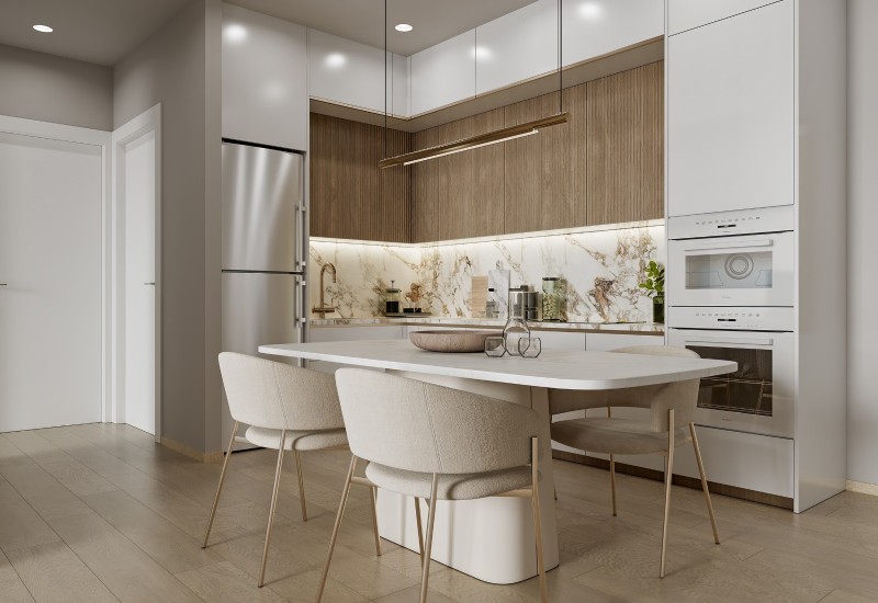 Interiors offer laminate parquet flooring in living areas and bedrooms, ceramic tiles in bathrooms, and quality finishes throughout. Kitchens come with modern cabinetry and soft-closing systems, and all bedrooms include built-in wardrobes. Bathrooms are fitted with contemporary sanitary ware and full wall tiling.