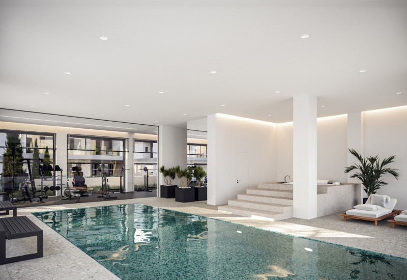 Installations de bien-être de luxe : piscines chauffées intérieure et extérieure, spa, salle de sport entièrement équipée et cours de fitness adaptés aux seniors.