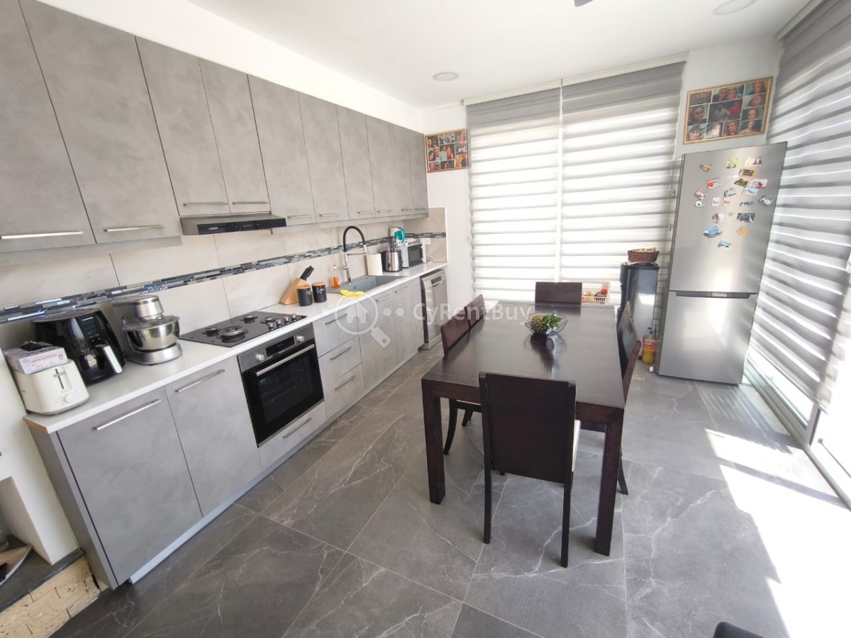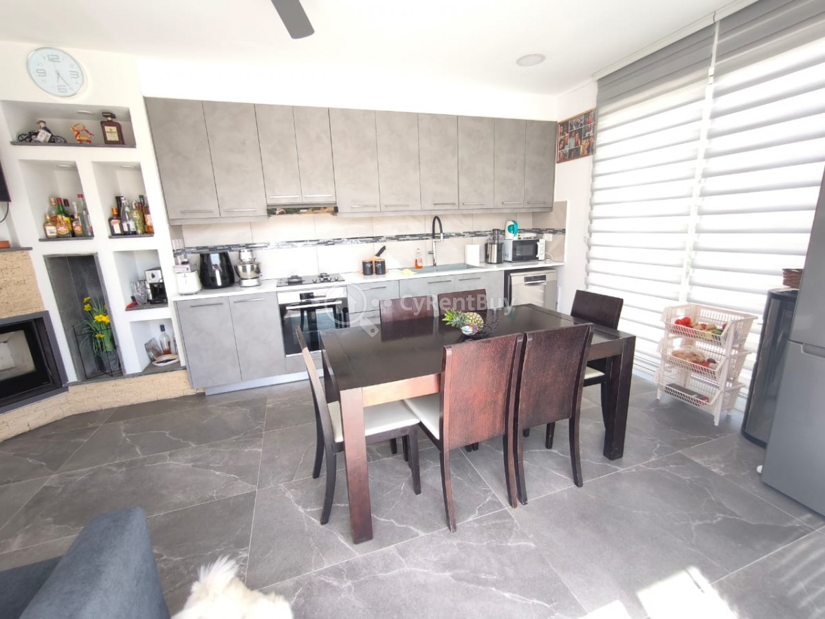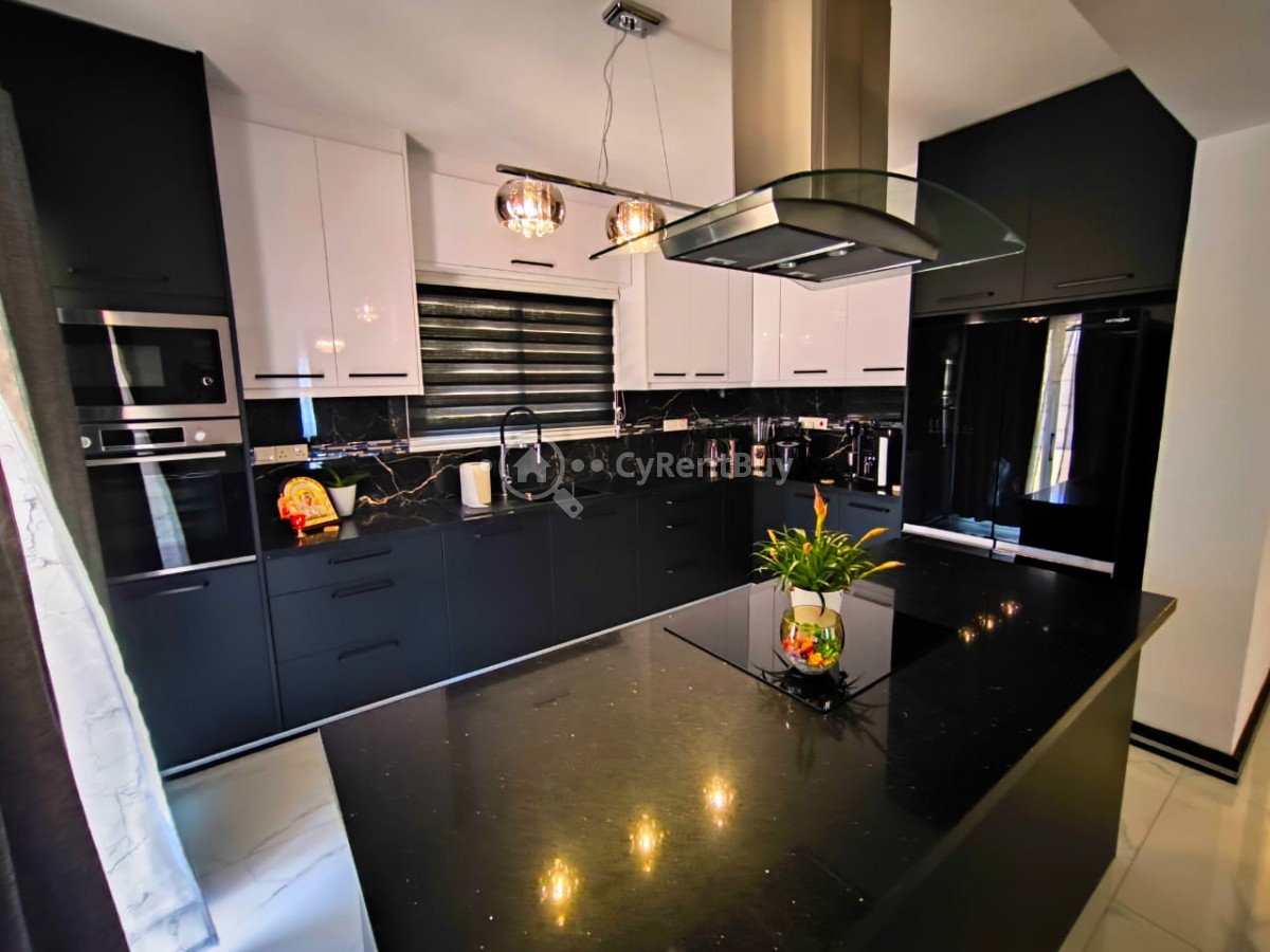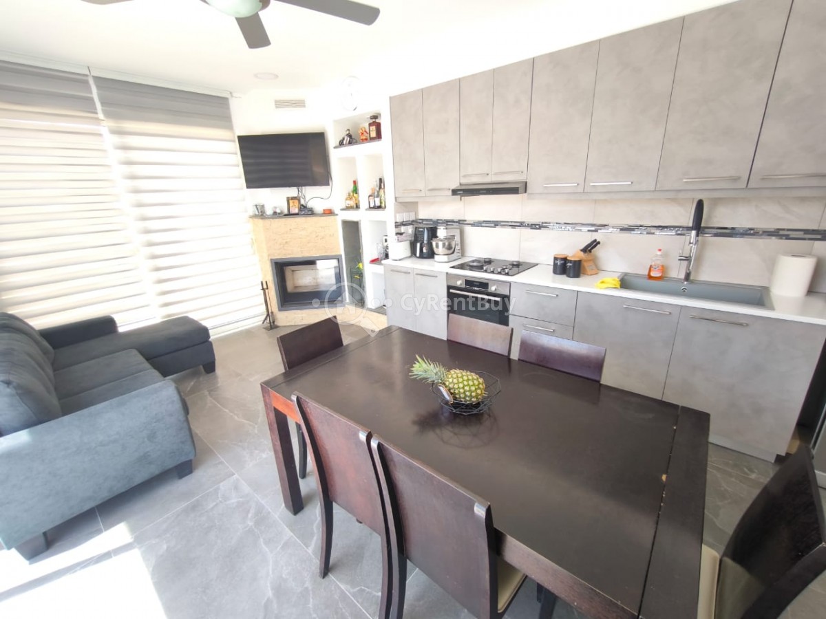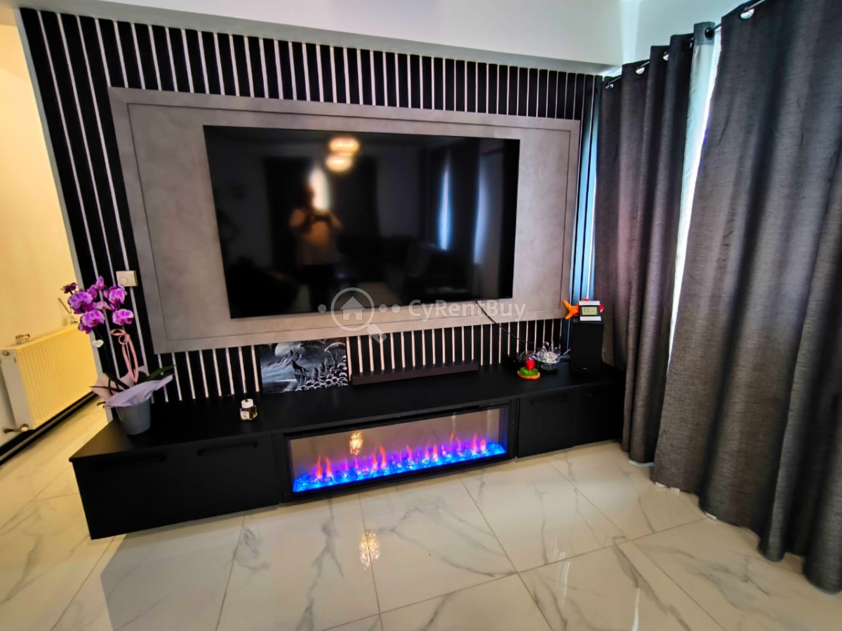 À l’intérieur, vous découvrirez un grand salon avec une télévision murale installée au-dessus d'une cheminée chaleureuse. La cuisine ouverte est entièrement équipée et présente un design élégant en noir.